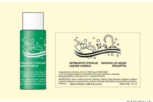 Detersivo liquido per lavare a mano piatti e stoviglie. In flaconcino da 30 ml, trasparente con tappo bianco, detersivo di colore verde. Prezzo riferito ad una confezione da 298 pz.
