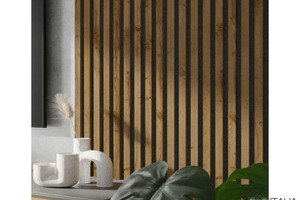 Pannello decorativo fonoassorbente in MDF da parete da comporre, con doghe rivestite in melaminico su 3 lati preassemblate su base in feltro nero.