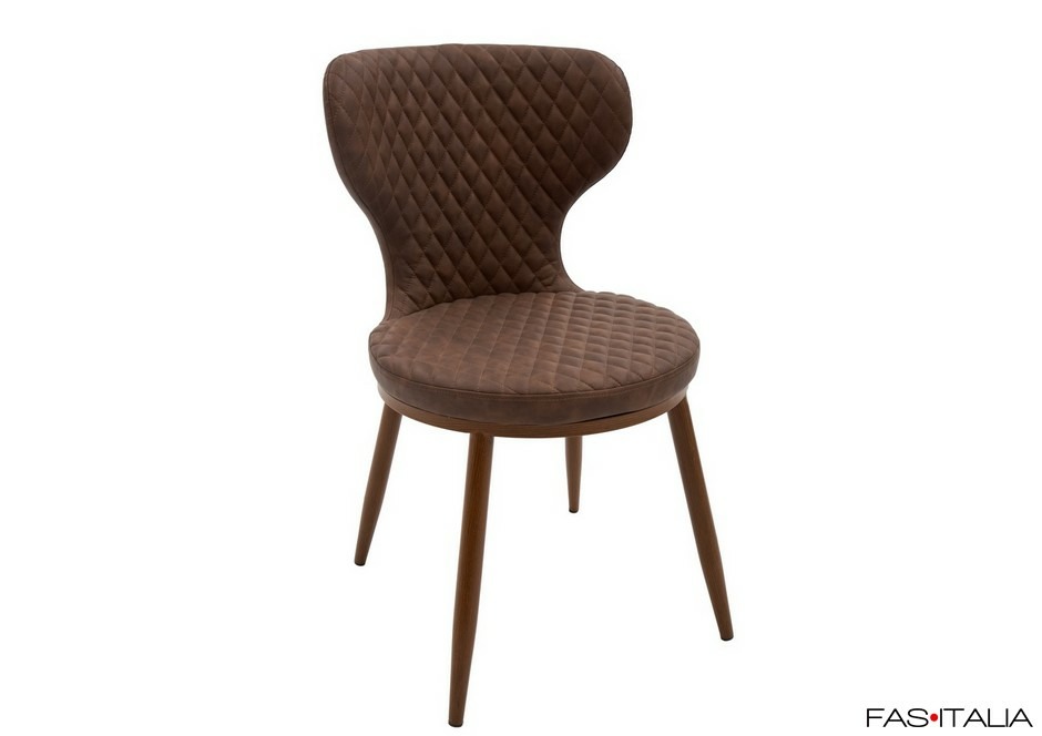 Sedia imbottita in ecopelle a rombi, gambe in legno. Disponibile nella finitura beige, grigia e cuoio. Dimensioni: 46x56x84 cm (LxPxH). Altezza seduta 46 cm.