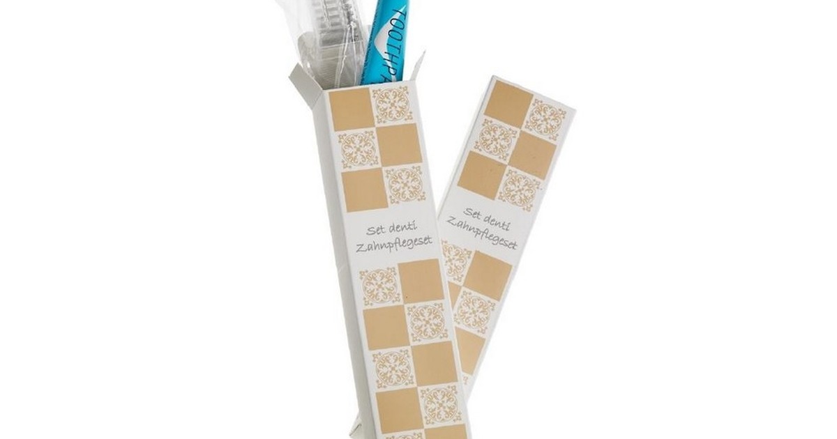 Set denti in astuccio di cartone personalizzato. Contiene: spazzolino e dentifricio.